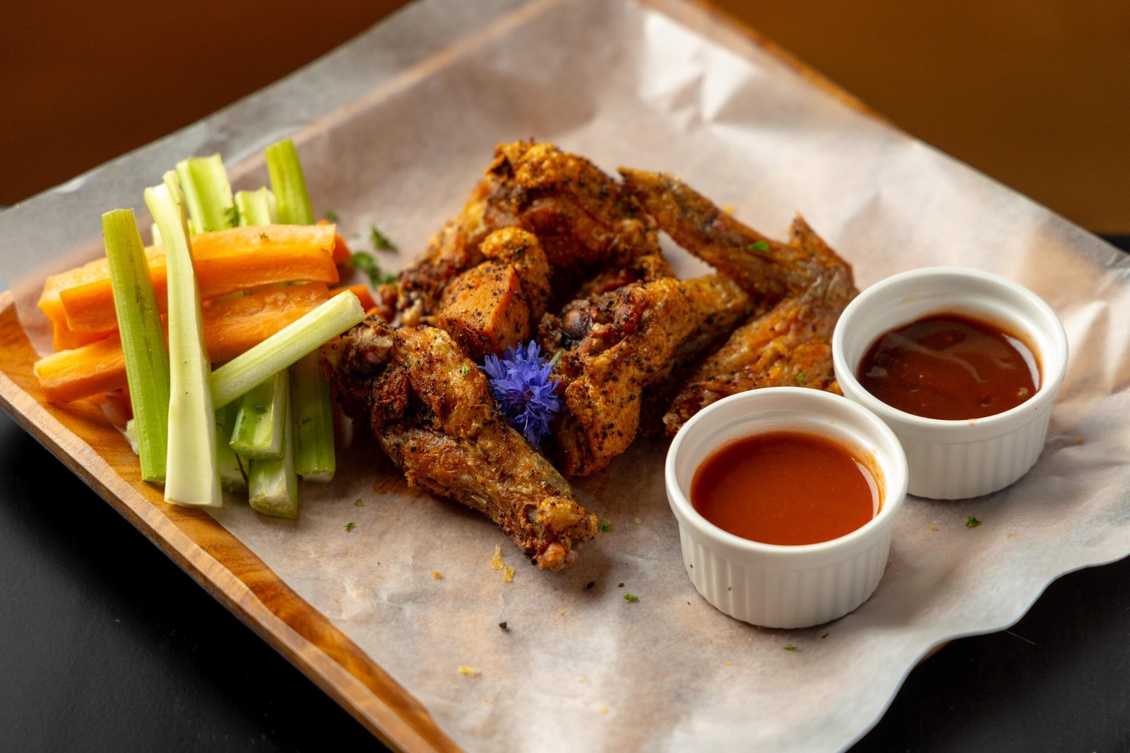Alitas de pollo acompañadas con apio y zanahoria